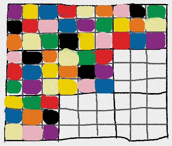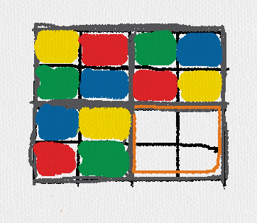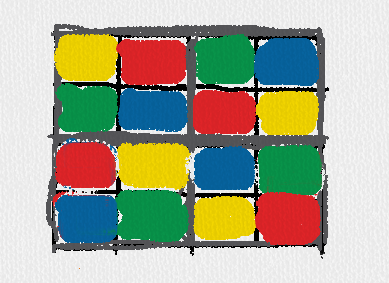 4. Plansza przygotowana, zatem zaczyna się zabawa. Ogólnie zadaniem dziecka będzie uzupełnić puste pola, tak aby kolory nie powtarzały się ani w linii pionowej, ani w poziomej, ani w małych kwadratach (tych ograniczonych szarymi liniami u mnie).